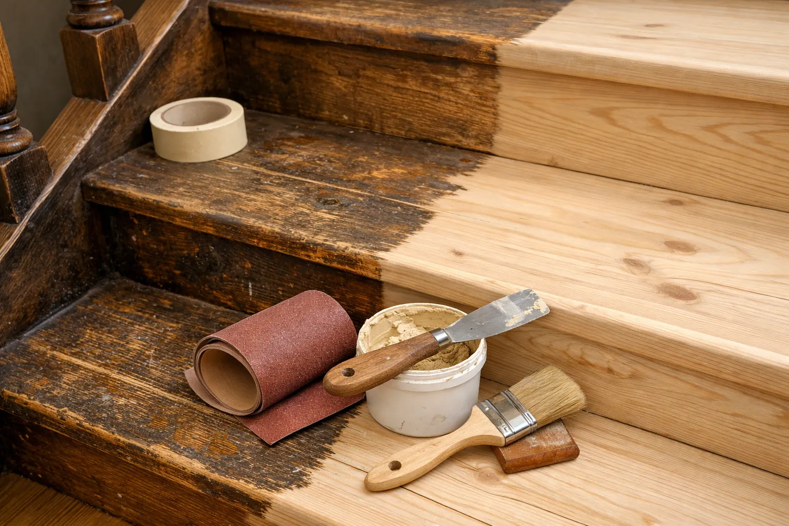 Après avoir jugé l’état de l’escalier, la préparation est essentielle pour une rénovation réussie. Débutez par un nettoyage minutieux du bois. Employez un tissu délicat ou une brosse afin d’éliminer la poussière et les impuretés. Dans le cas où le bois contient des marques de graisse ou de résine, on peut faire appel à un dégraissant doux.
